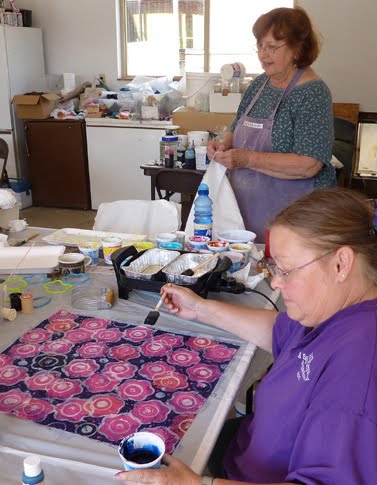 1. Maureen's NY book cover 2. Kay's book cover 3. Maureen 4. Maureen's book cover 5. Textured ice dyeing 6 & 7. Ice dyed 8 & 9. Amy's journal pages 10. Peggy pin weaving 11. Maureen, Vera, Peggy & Corienne 12 & 13. Faux weaving